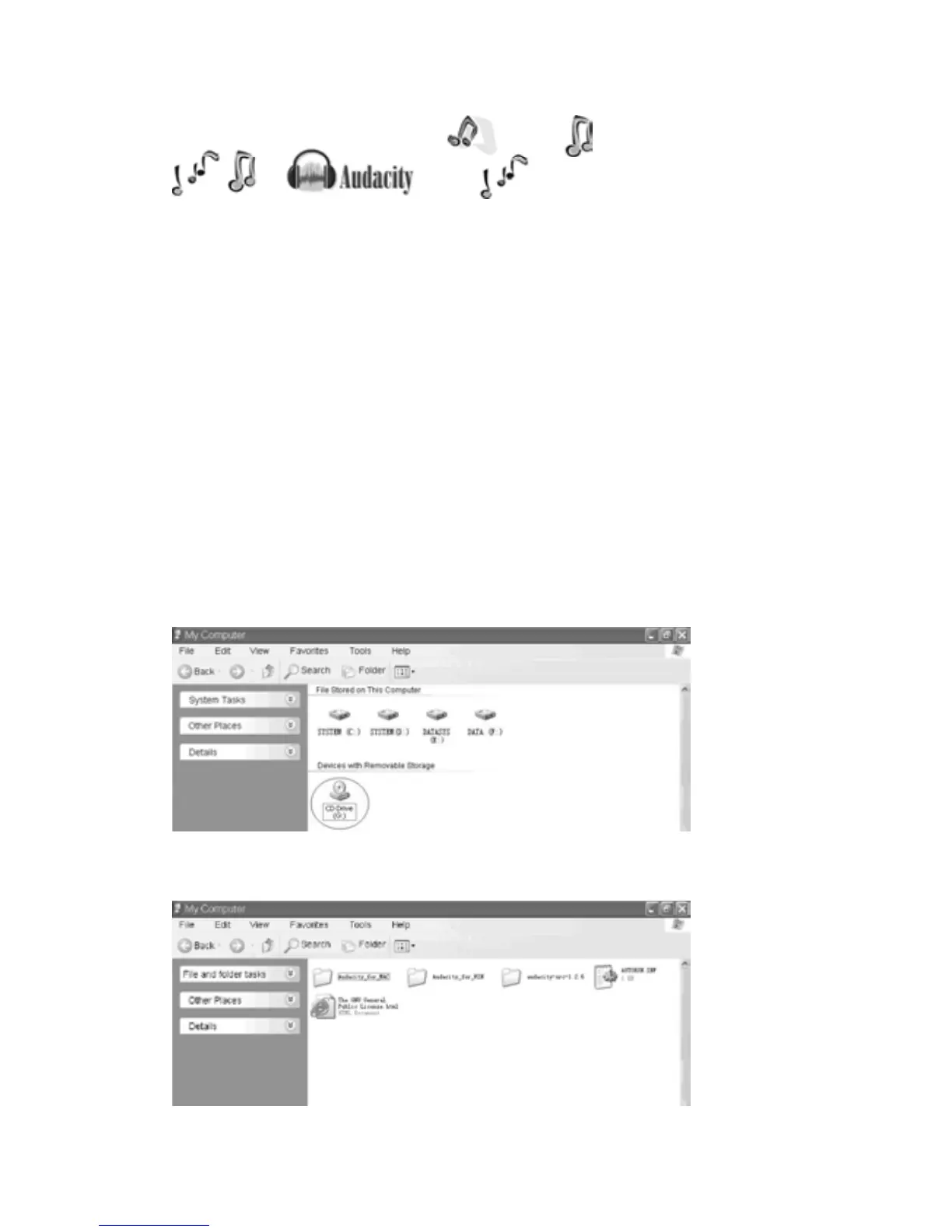 1. Please insert the Audacity softwaredisk thatcomeswith your unit. Go toMy Computer and