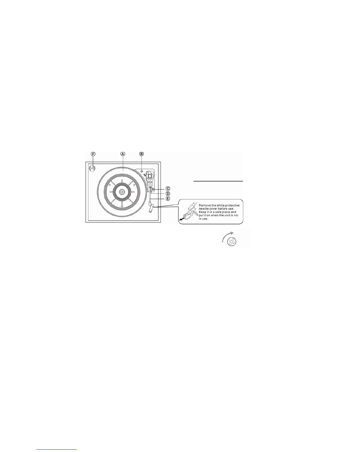 E. Tone Arm. (Before use, completely loosen the fixed plastic tie on the tone arm and uplift tone arm.)