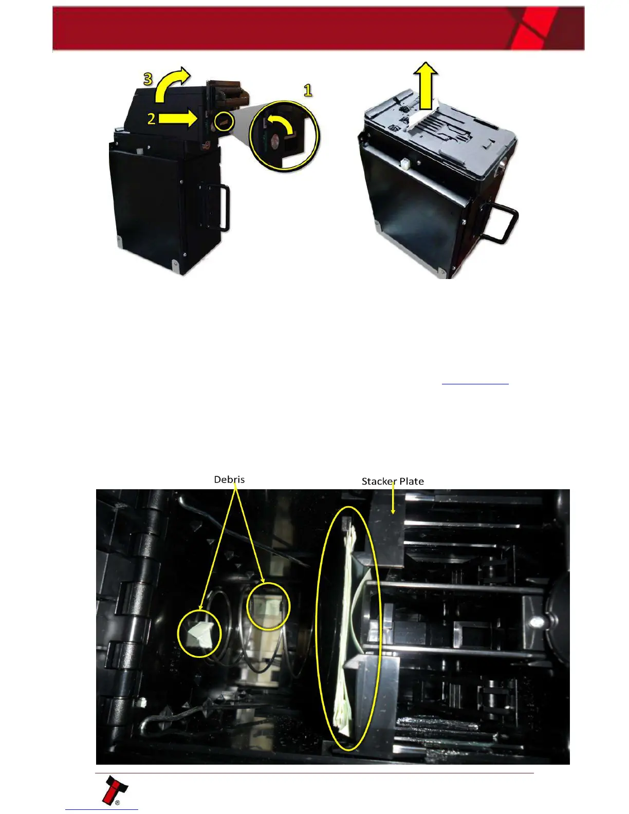 then open the cashbox. Remove any visible jammed notes or debris, if no debris is
