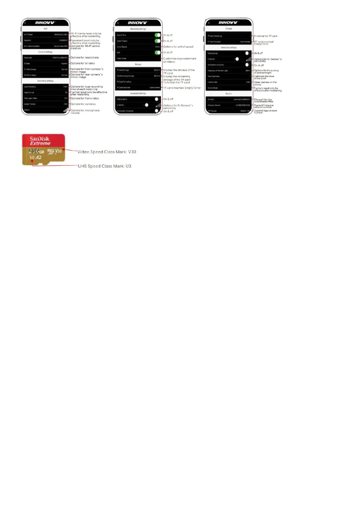 INNOVA K3 dashcam requires at least a U1 (UHS Speed Class 1), V10 (Video SpeedClass 10) rated, or faster TF card to ensure better performance.