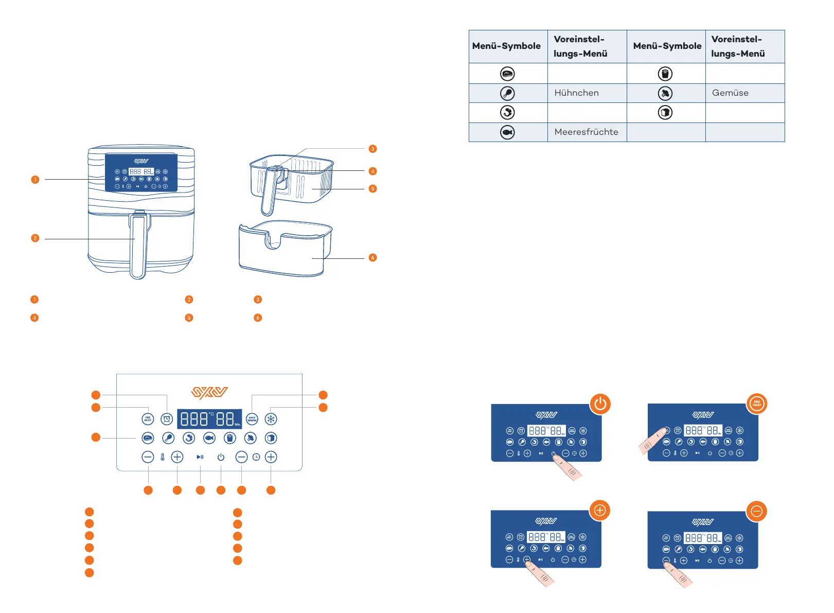 1. Stellen Sie die Heißluftfritteuse auf eine stabile, horizontale, ebene und hitzeresistente Fläche.
