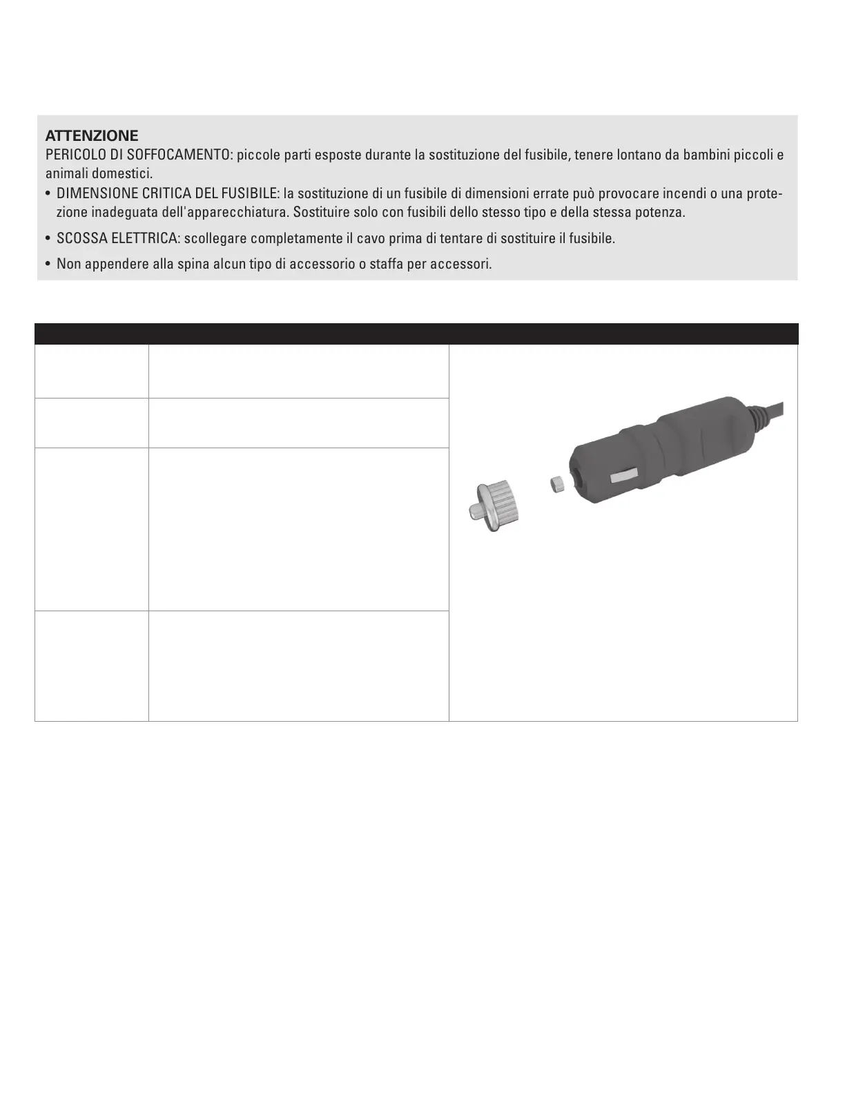 PERICOLO DI SOFFOCAMENTO: piccole parti esposte durante la sostituzione del fusibile, tenere lontano da bambini piccoli e