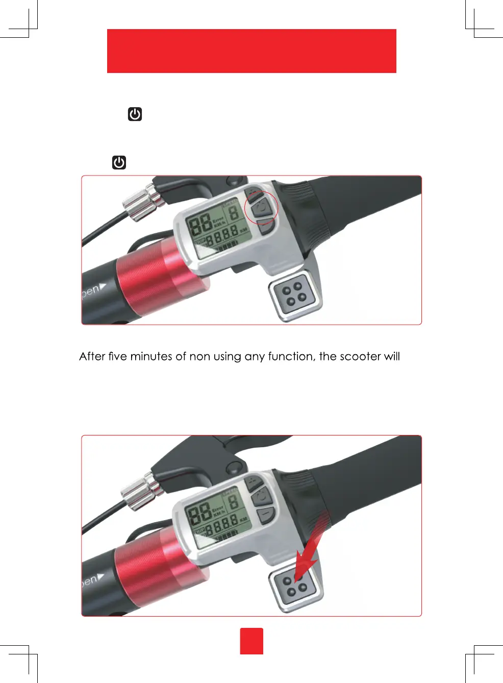 Pressing to power the scooter on.