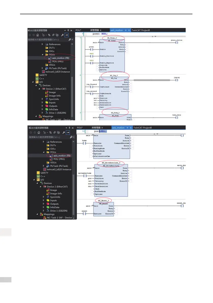Create a new FB, add MC_power, MC_jog, MC_home, MC_absolute, MC_reset to FB.