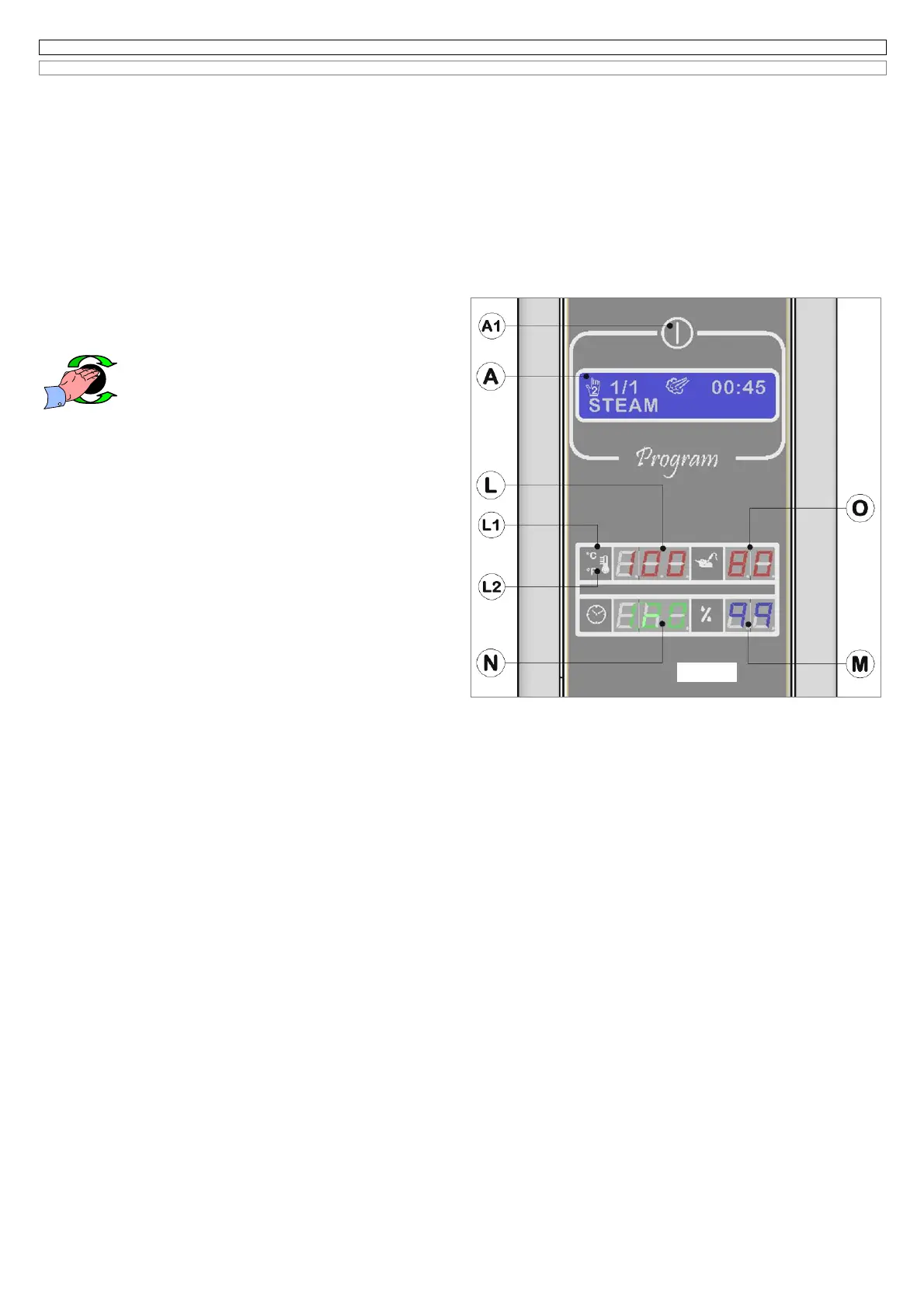 The electronic system of the oven shows on the display (A) the message “HIGH TEMP.” , when you select the steam phase with a cooking chamber