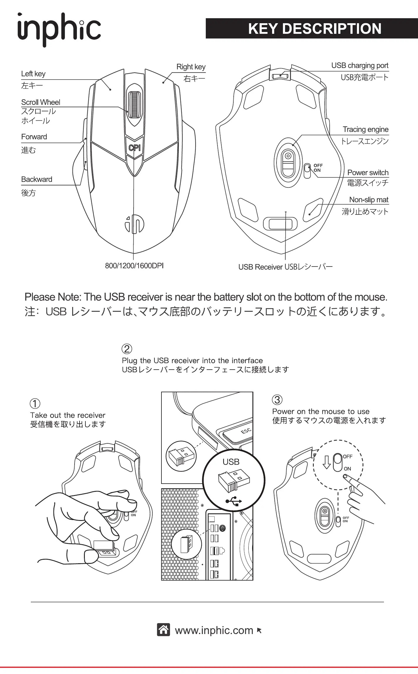 Please Note: The USB receiveris nearthe batteryslot on the ll)ttom of the mouse