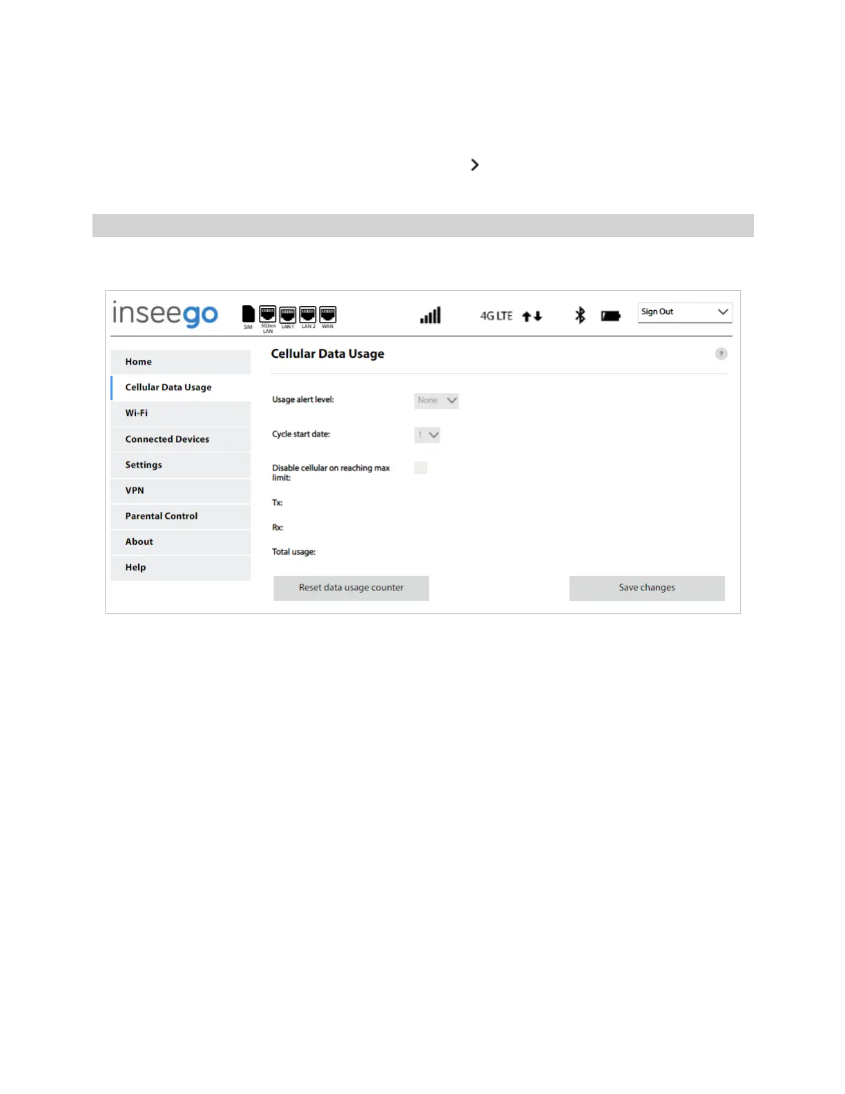 select Cellular Data Usage from the Web UI side menu. The Cellular Data Usage page appears.