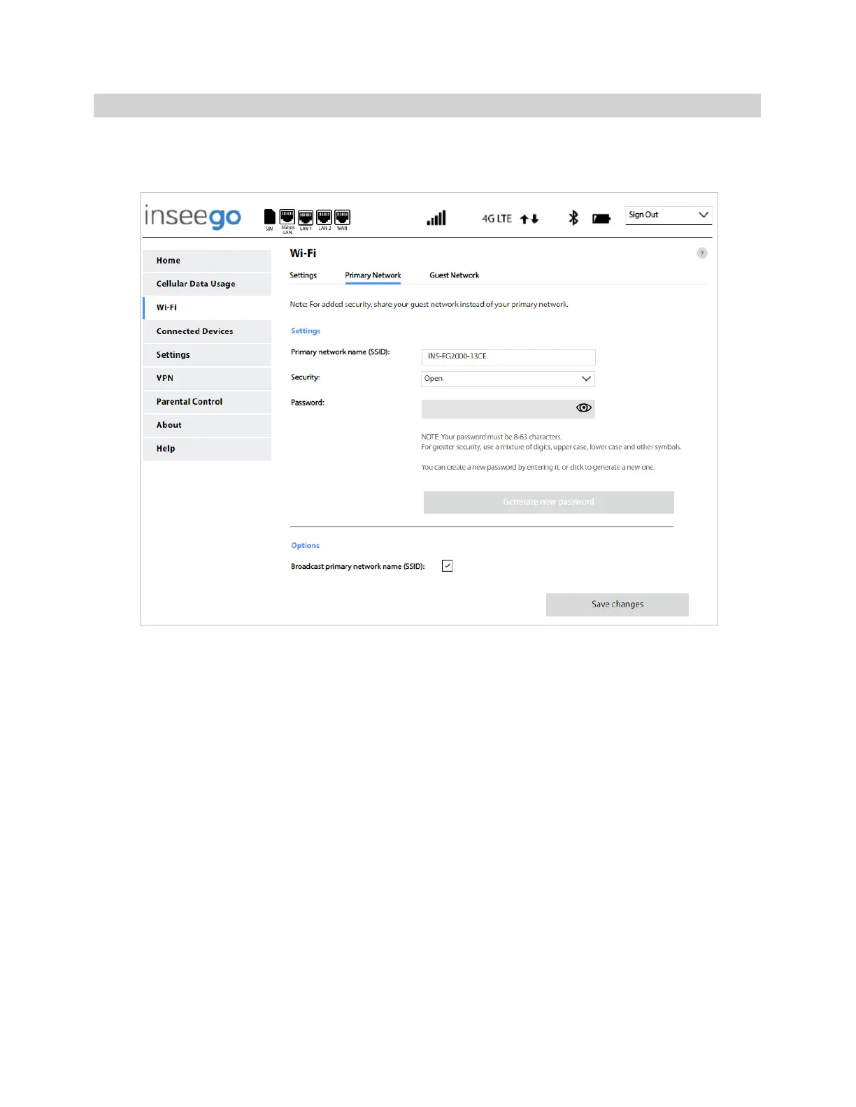 Primary network name (SSID): Enter a primary network name (SSID) to set up or change the primary