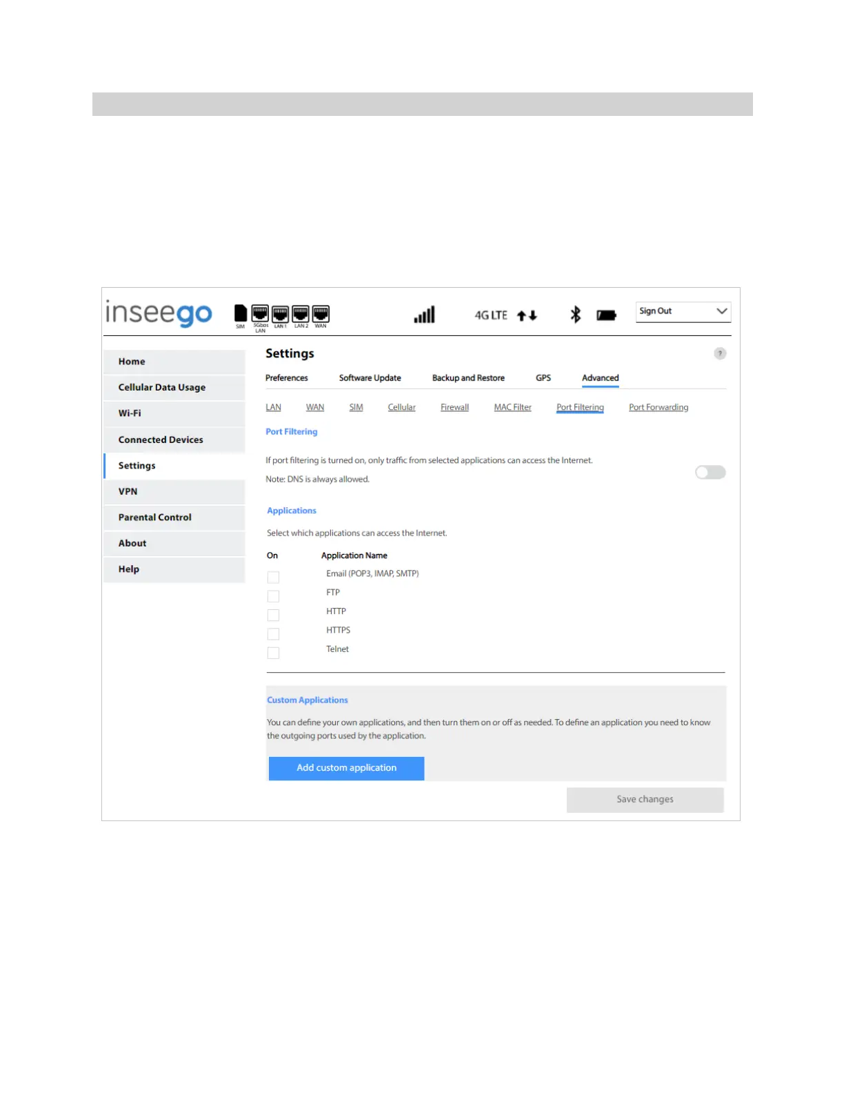 NOTE: You can also view the current Port Filtering setting (ON/OFF) in the Settings panel on the Web