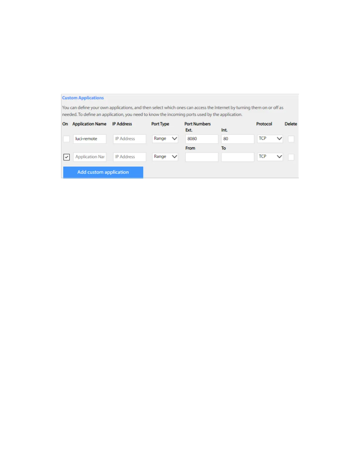 Add custom application: Use this button to add a new row to the custom applications list.