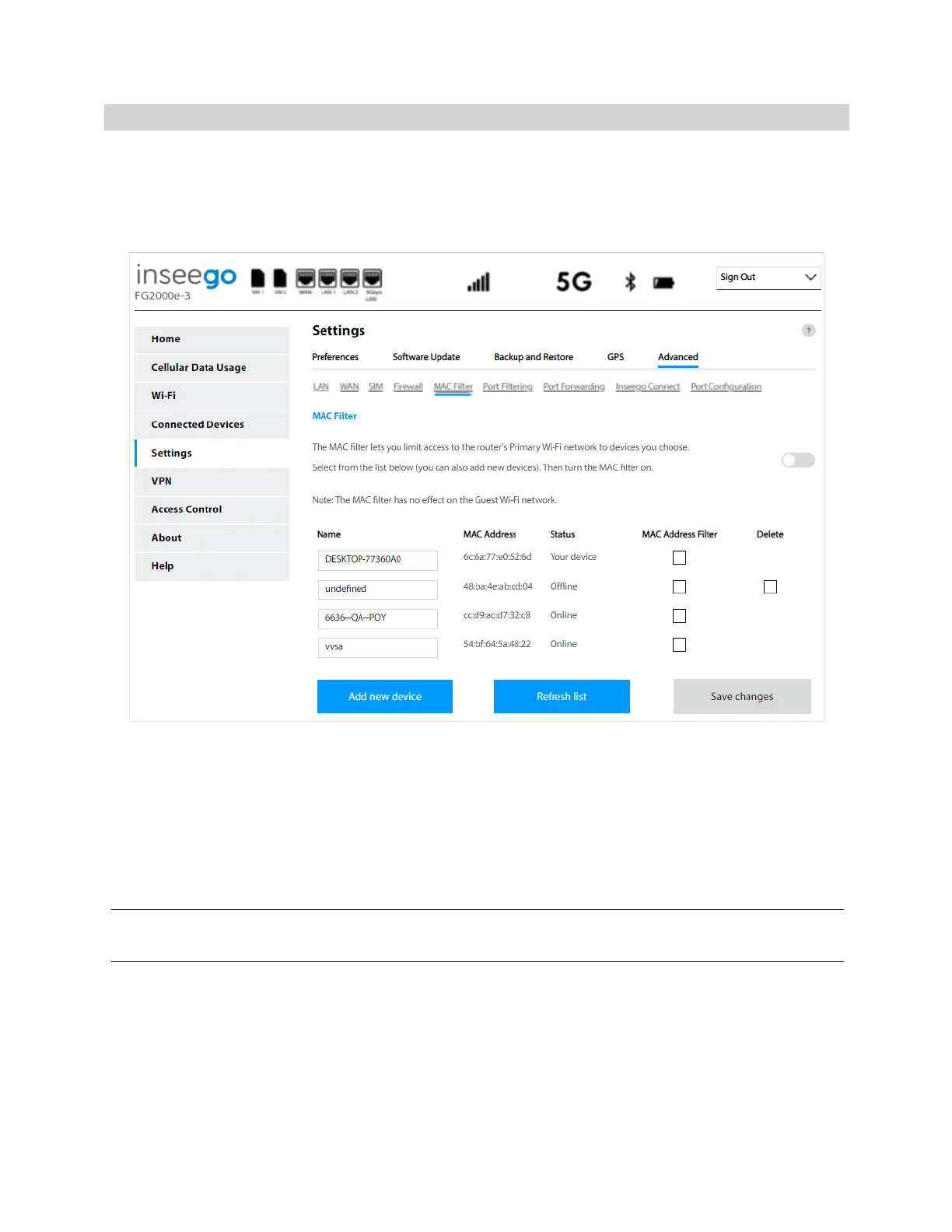 The MAC filter allows only selected devices to access the 5G Indoor Router primary Wi-Fi network. By