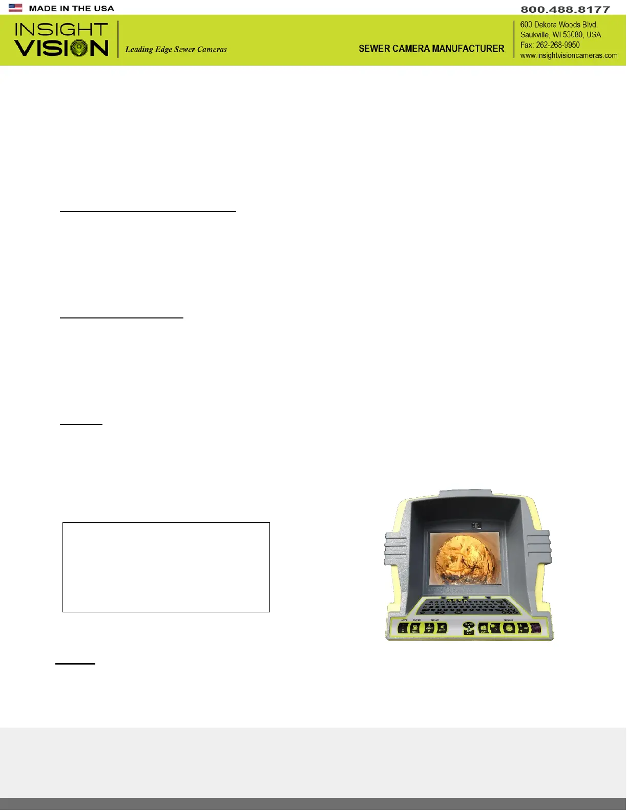 monitor. Geared to inspect sewer pipes from 3” up to 12” inch diameter. A built-in sonde which transmit a 512