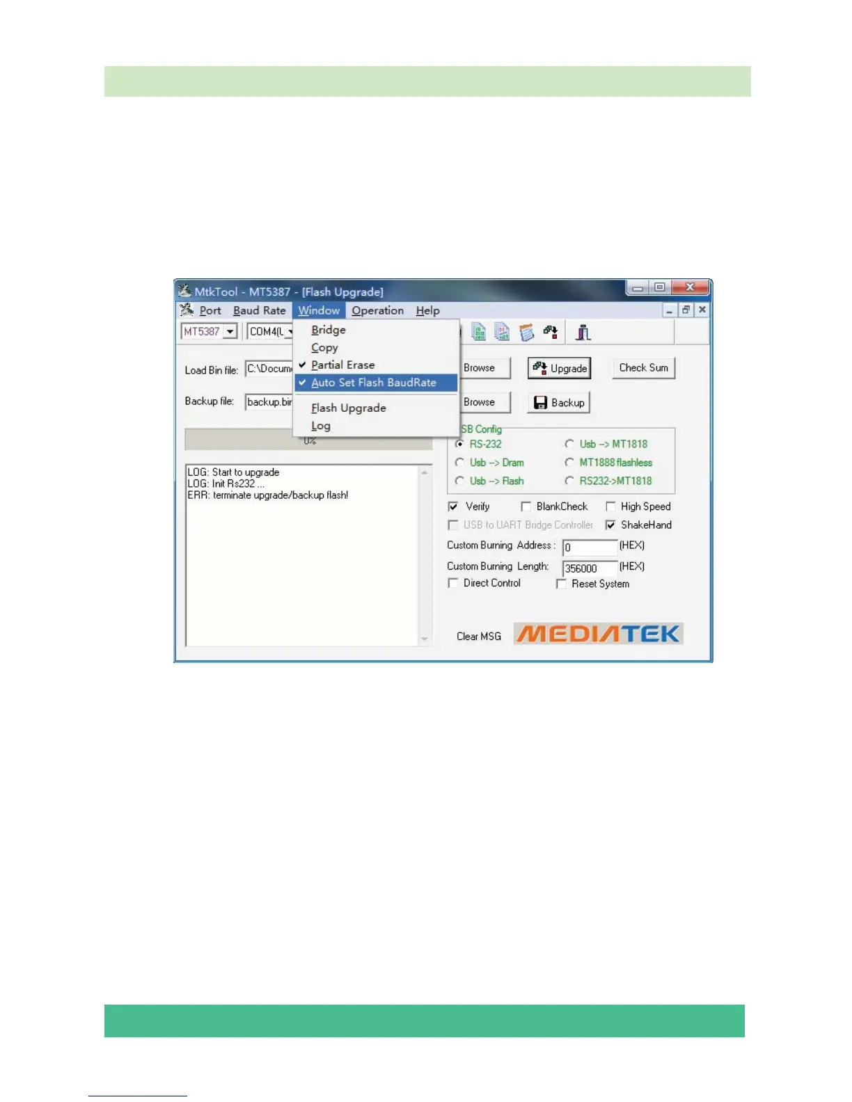Note: Where or not click the “Auto Set Flash Baud Rate” in the “window” menu depends