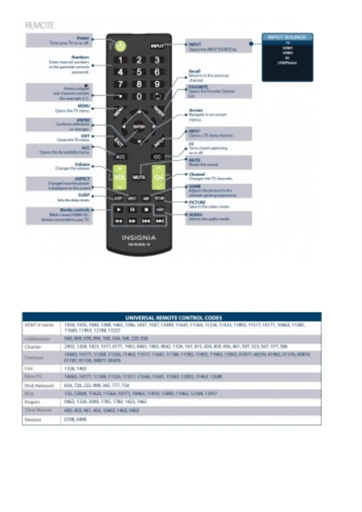 Insignia remote control, see the table below for common codes.