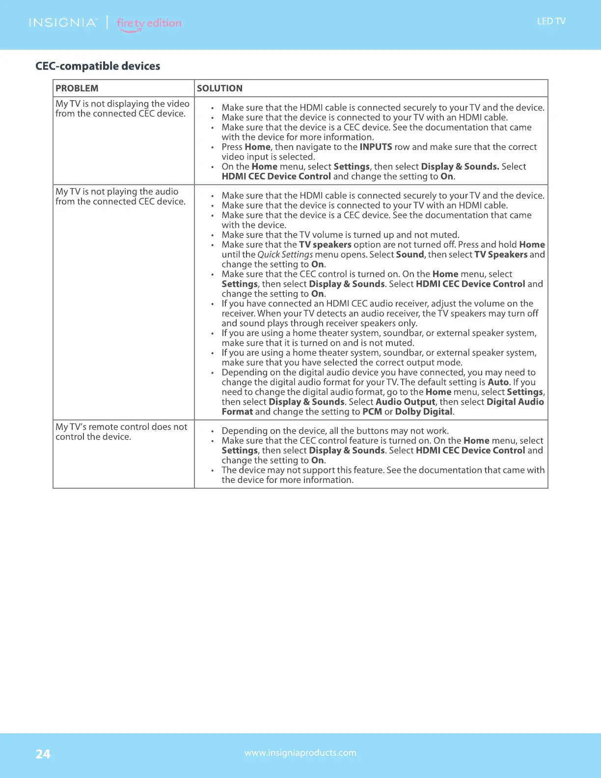 Insignia NS-50DF710NA21 - CEC Device Compatibility Issues; Video and Audio Playback Problems
