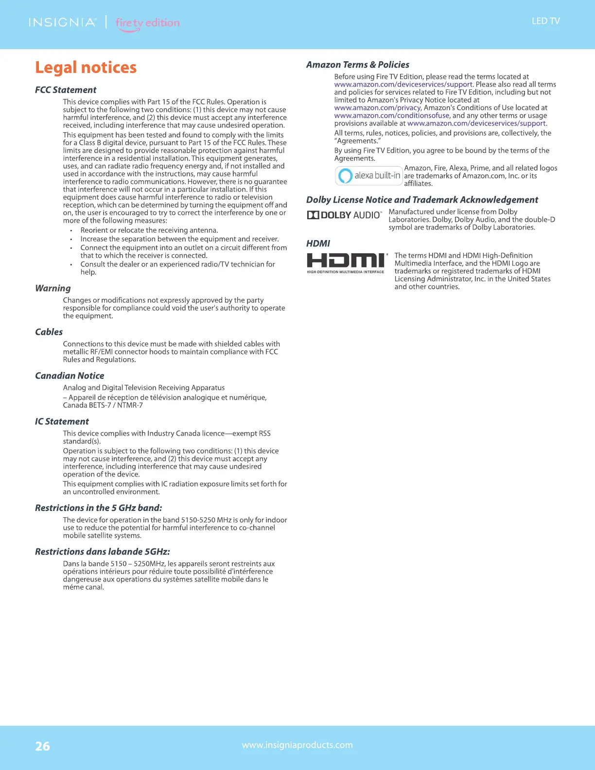 Insignia NS-50DF710NA21 - Legal and Compliance Information; Regulatory Compliance Statements; Amazon Terms and Policies; Technology Trademark Notices