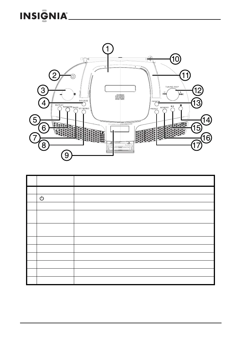 11 Carrying handle Use to carry your boombox from one location to another.