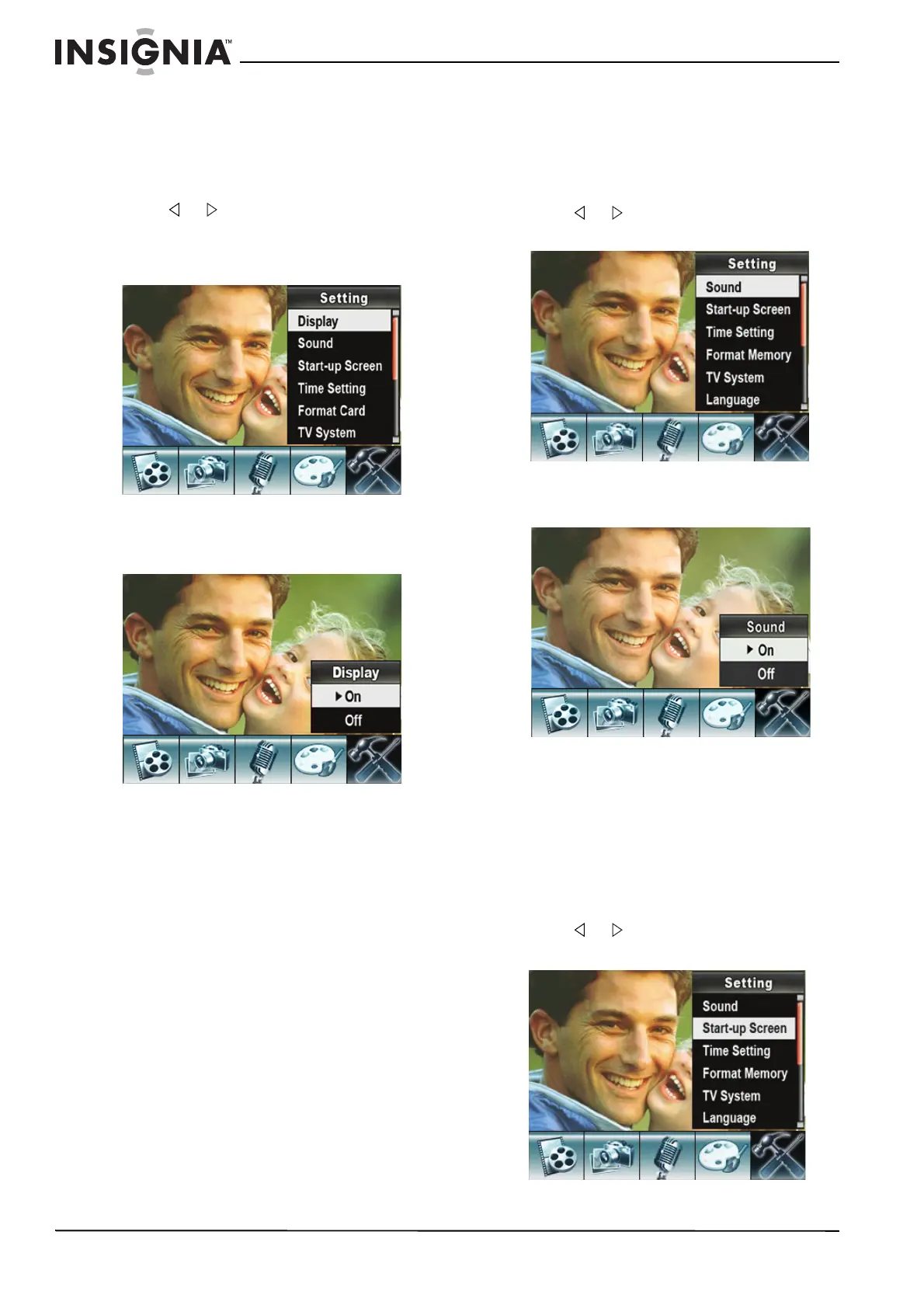 4 Press T (up) or W (down) to select On or Off,