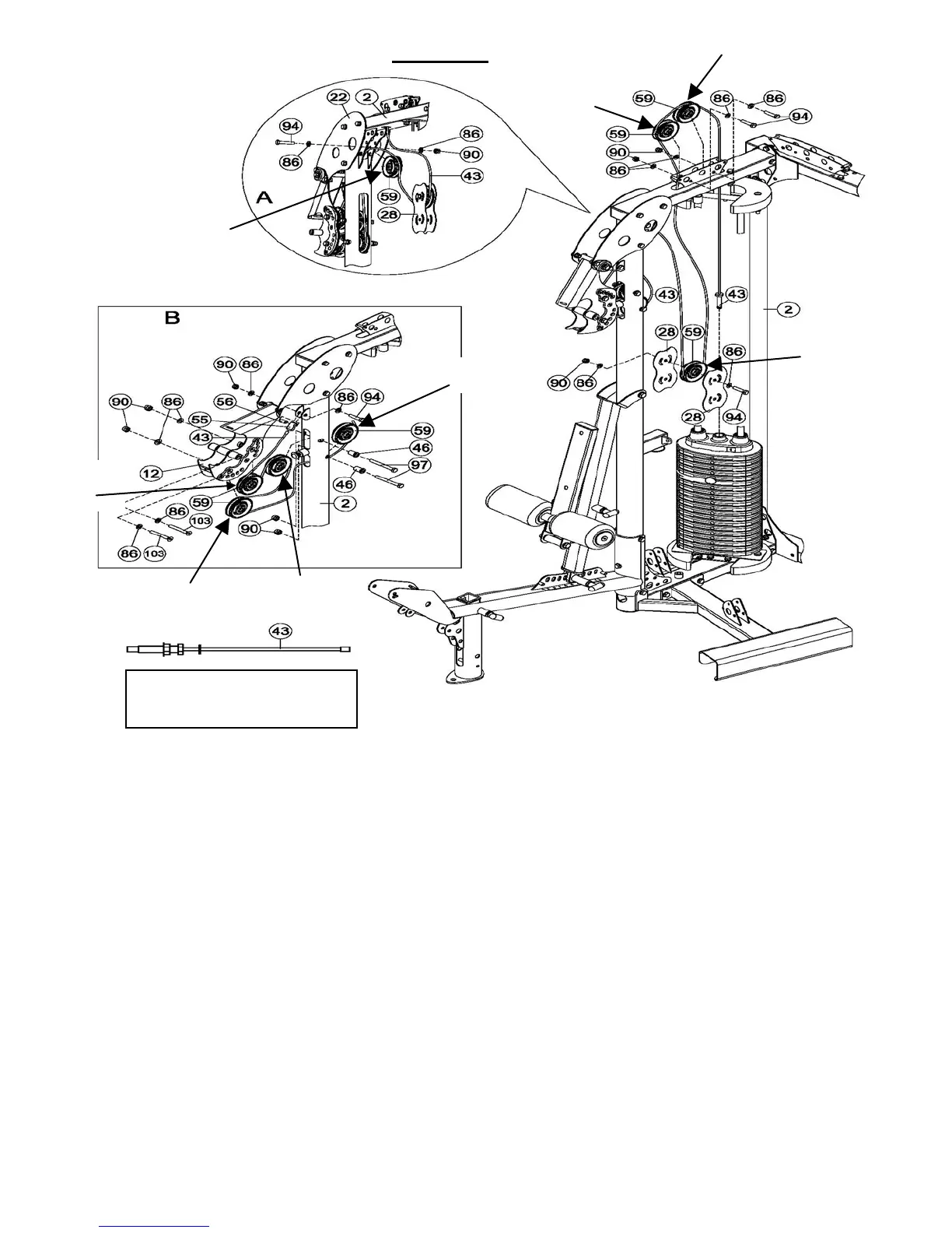 Attach pulleys 3 and 4 to the Main Upright (2) as shown with the M10*45 bolts (94). Pulley 5 is