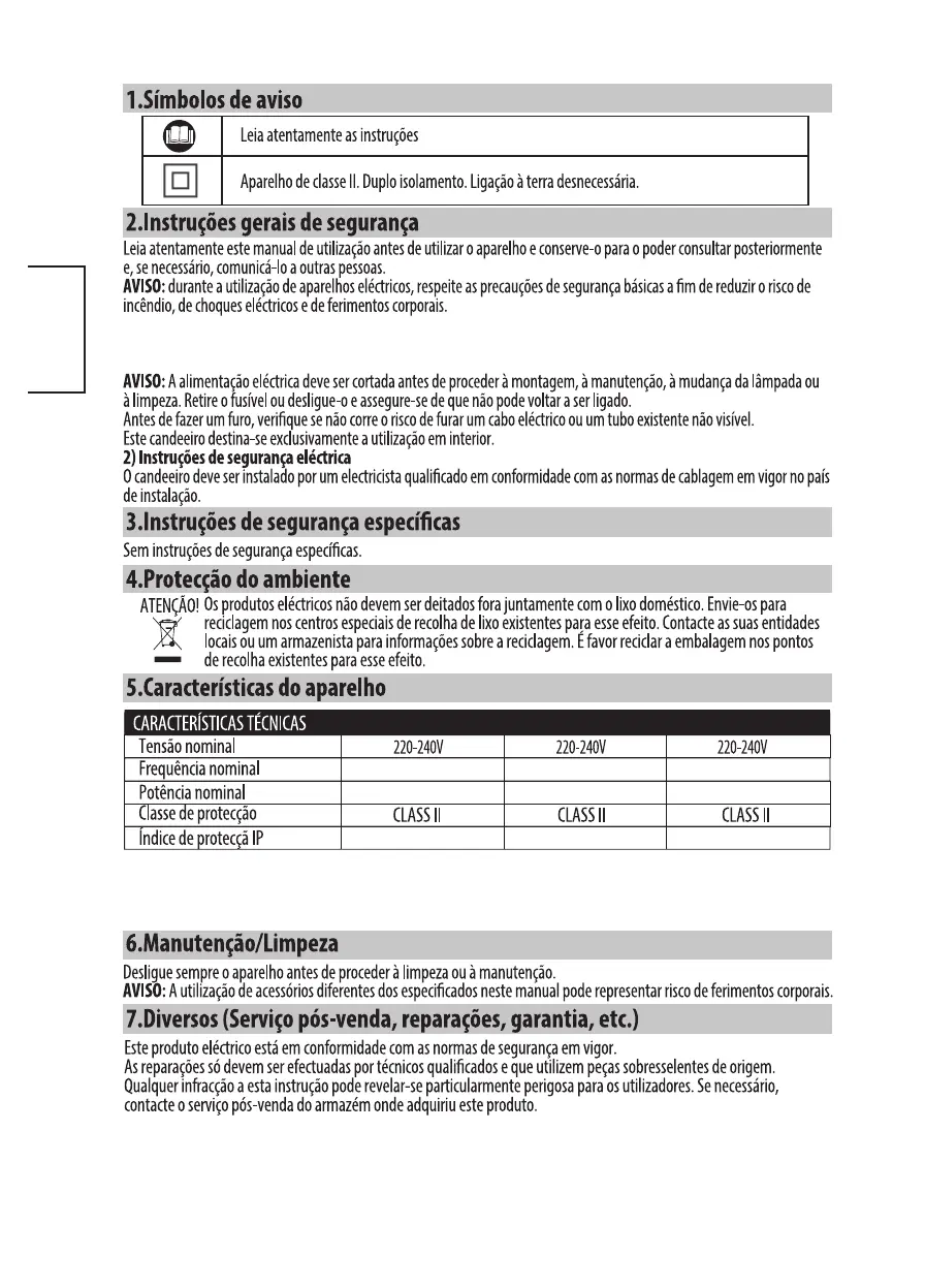 Verifique se as especificações eléctricas deste candeeiro são compatíveis com a sua instalação.