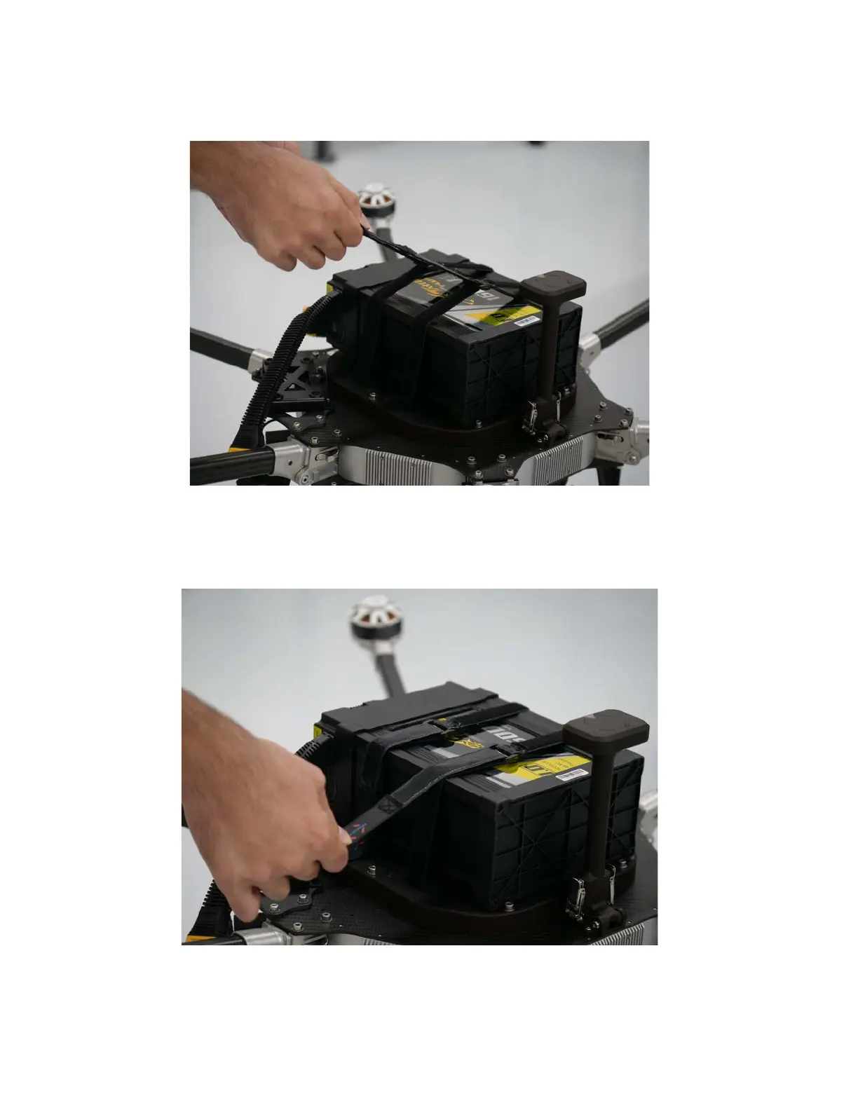 Pull the straps tightly over the battery, securing the velcro strap to itself close to the body