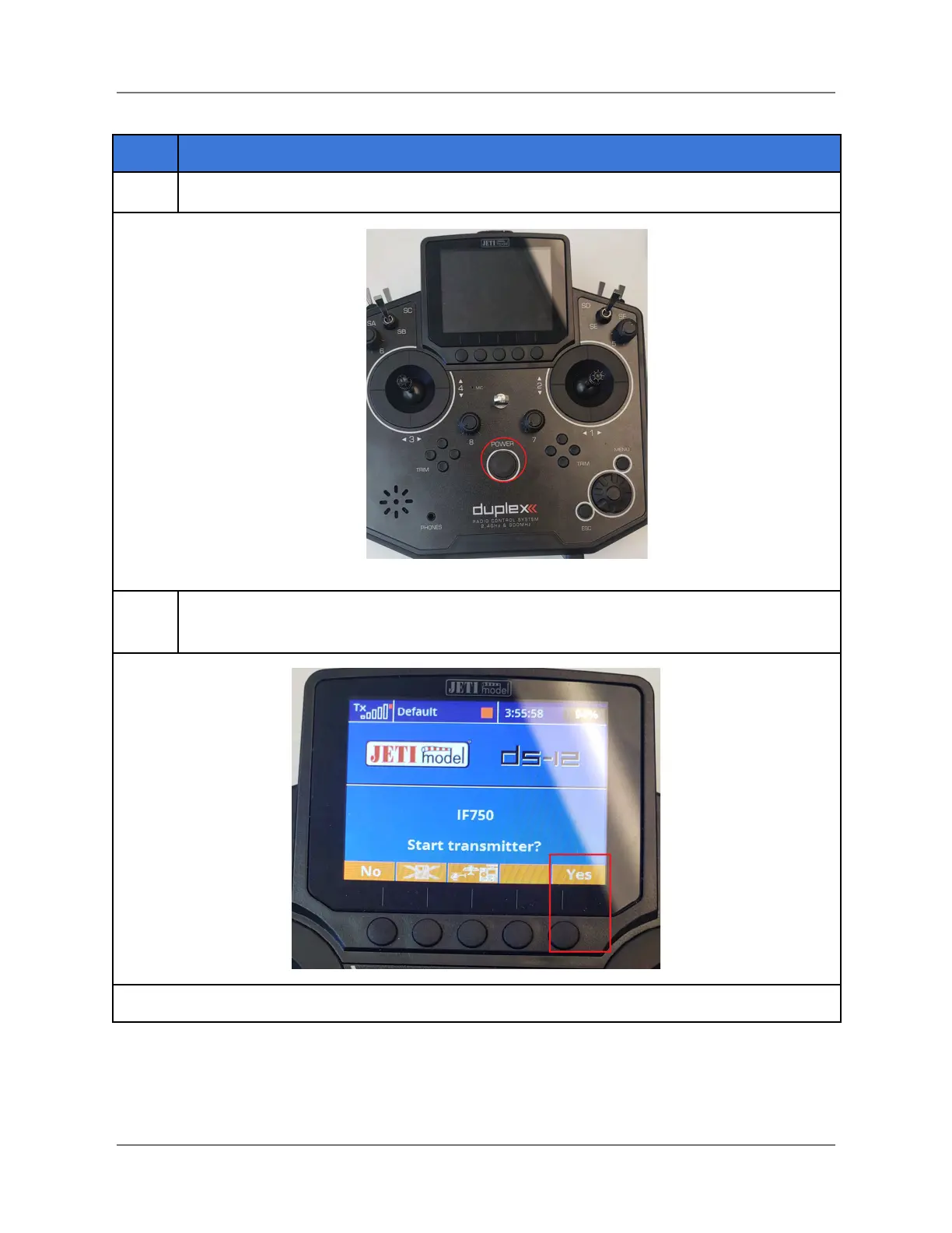 Turn on the Jeti DS-12 by pressing the Power button for two seconds (see below).
