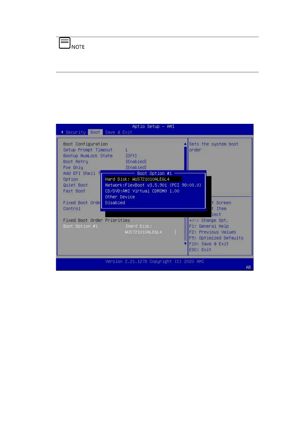 Go to the Boot tab and select Boot Option #1 to set the boot device.