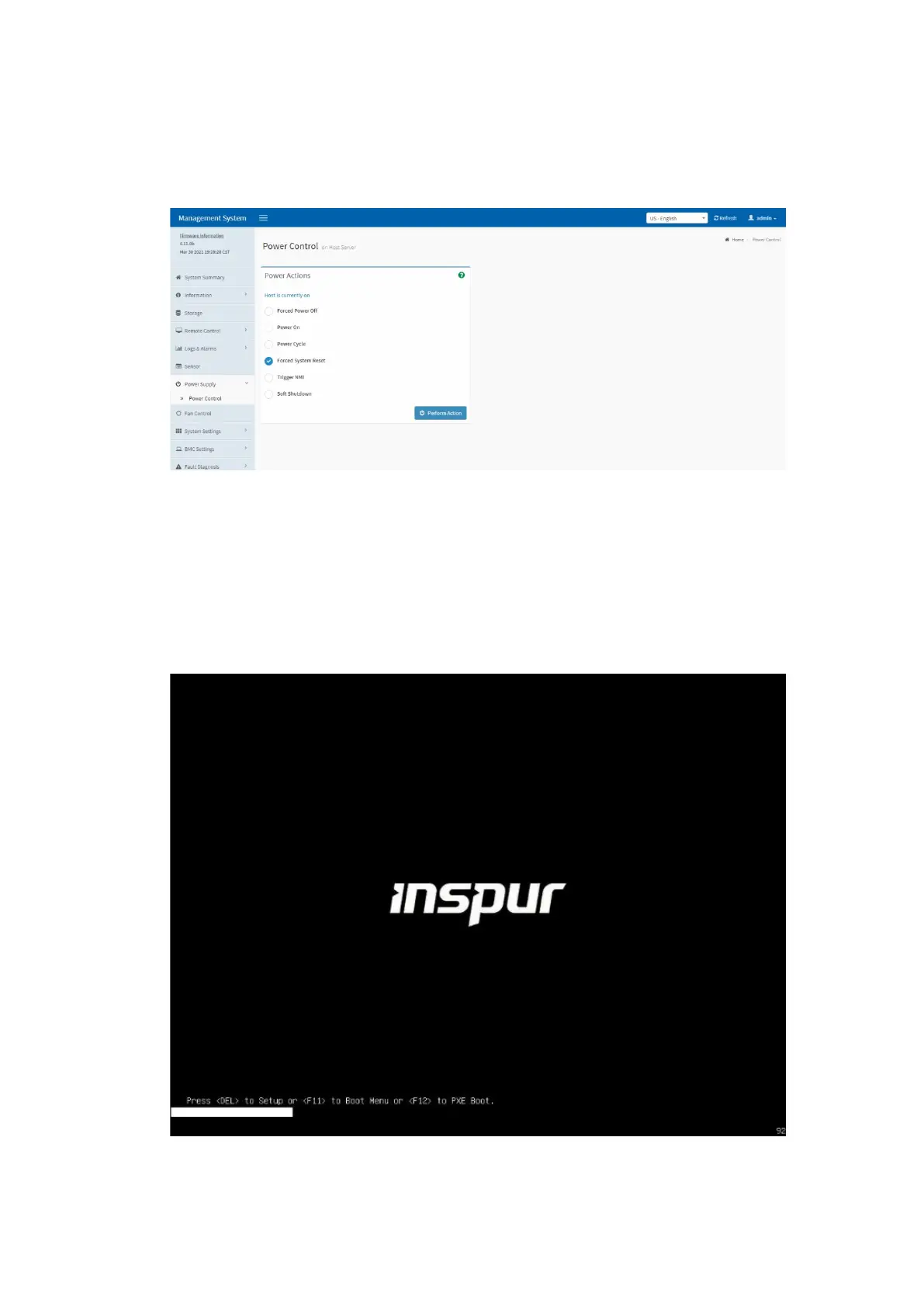 Power Control > Forced System Reset, and click Perform Action to restart the
