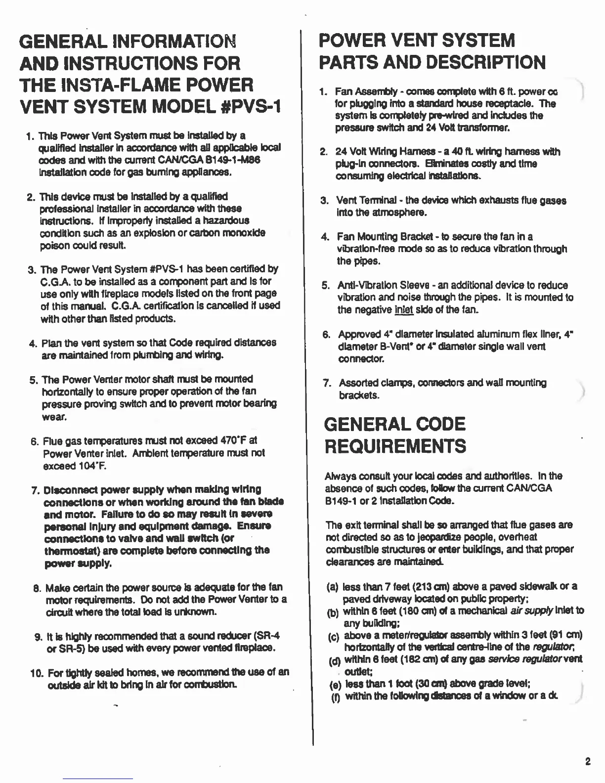 Insta-Flame PVS-1 - GENERAL INFORMATION AND INSTRUCTIONS; Power Vent System Parts and Description; General Code Requirements