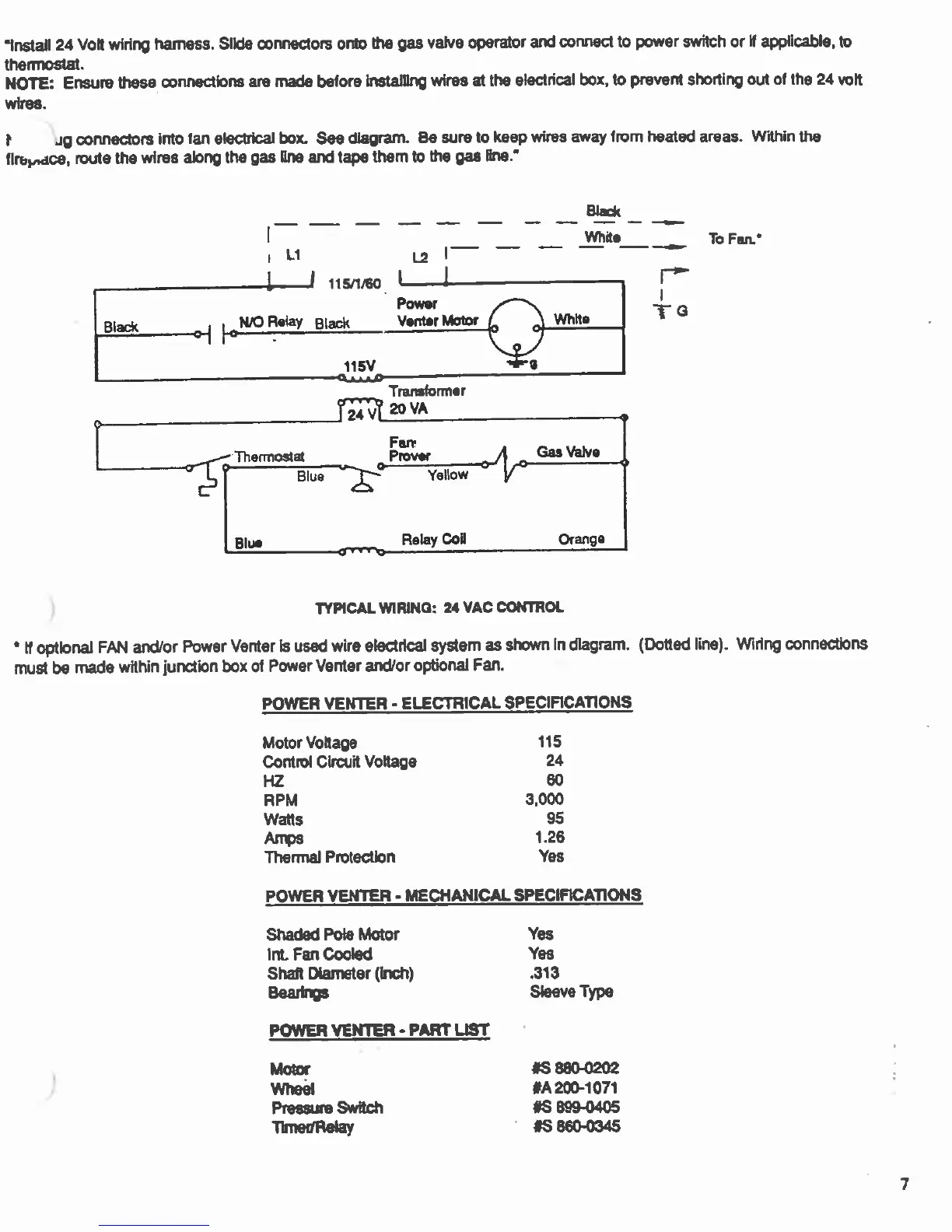 Insta-Flame PVS-1 - SPECIFICATIONS AND WIRING; Typical 24 VAC Control Wiring Diagram; Power Venter Electrical Specifications; Power Venter Mechanical Specifications