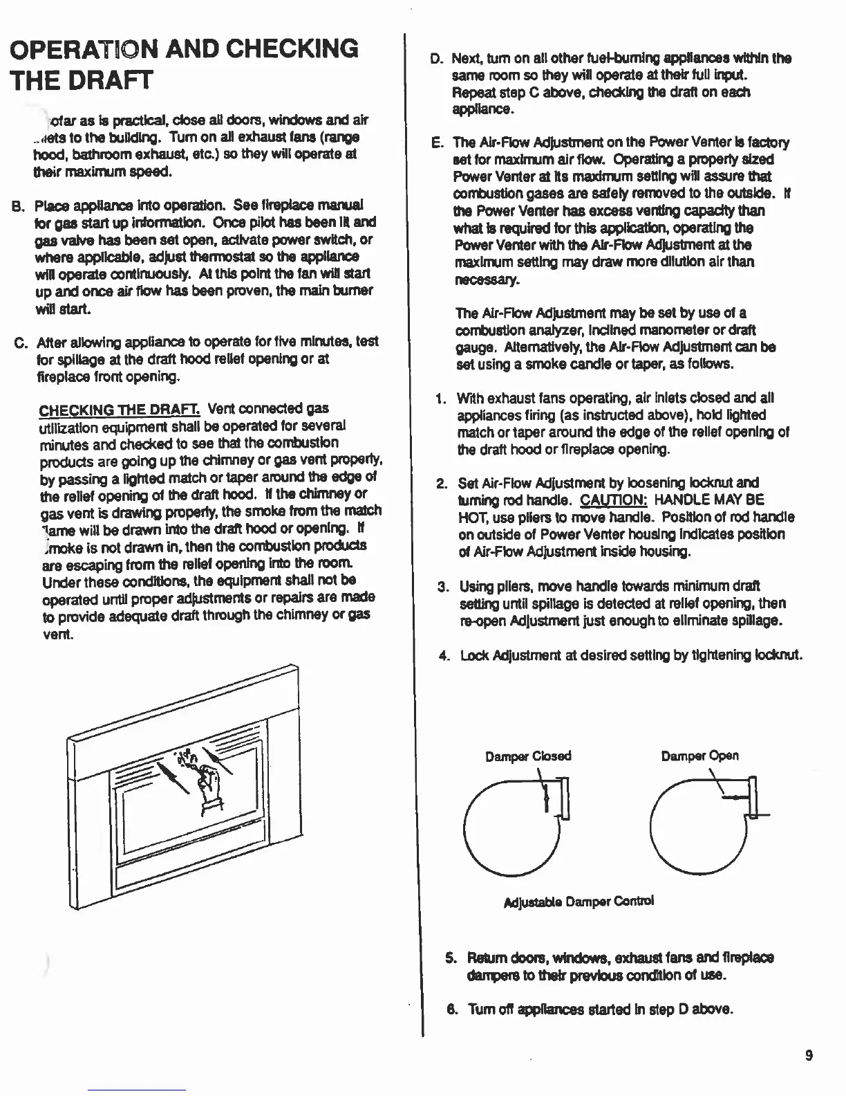 Insta-Flame PVS-1 - OPERATION AND DRAFT CHECKING; Appliance Operation and Initial Checks; Draft Checking Procedure; Air-Flow Adjustment Procedure