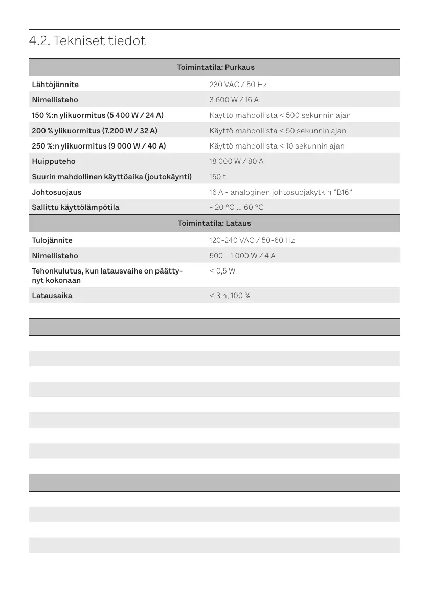 200 % ylikuormitus (7.200 W / 32 A) Käyttö mahdollista < 50 sekunnin ajan
