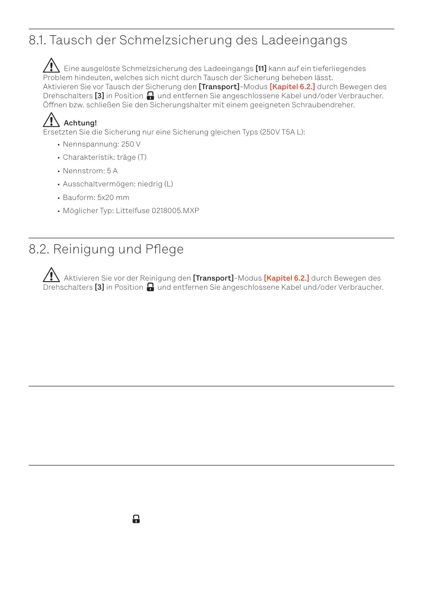 Aktivieren Sie vor Tausch der Sicherung den [Transport]-Modus [Kapitel 6.2.] durch Bewegen des