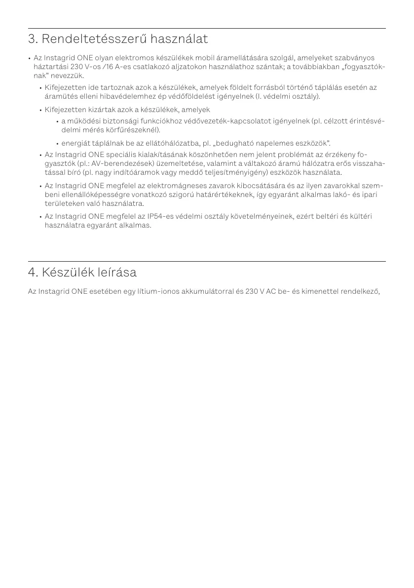 • Az Instagrid ONE megfelel az IP54-es védelmi osztály követelményeinek, ezért beltéri és kültéri