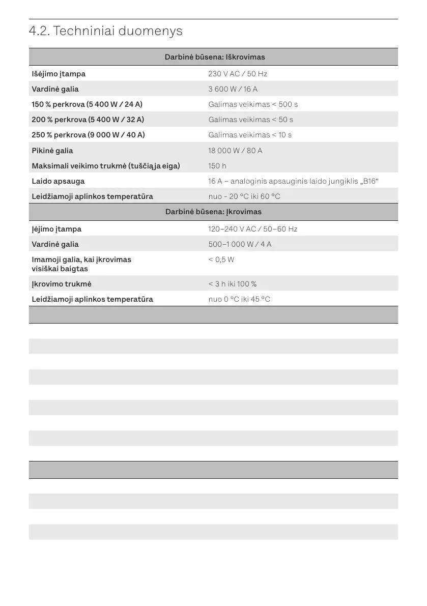 150 % perkrova (5 400 W / 24 A) Galimas veikimas < 500 s