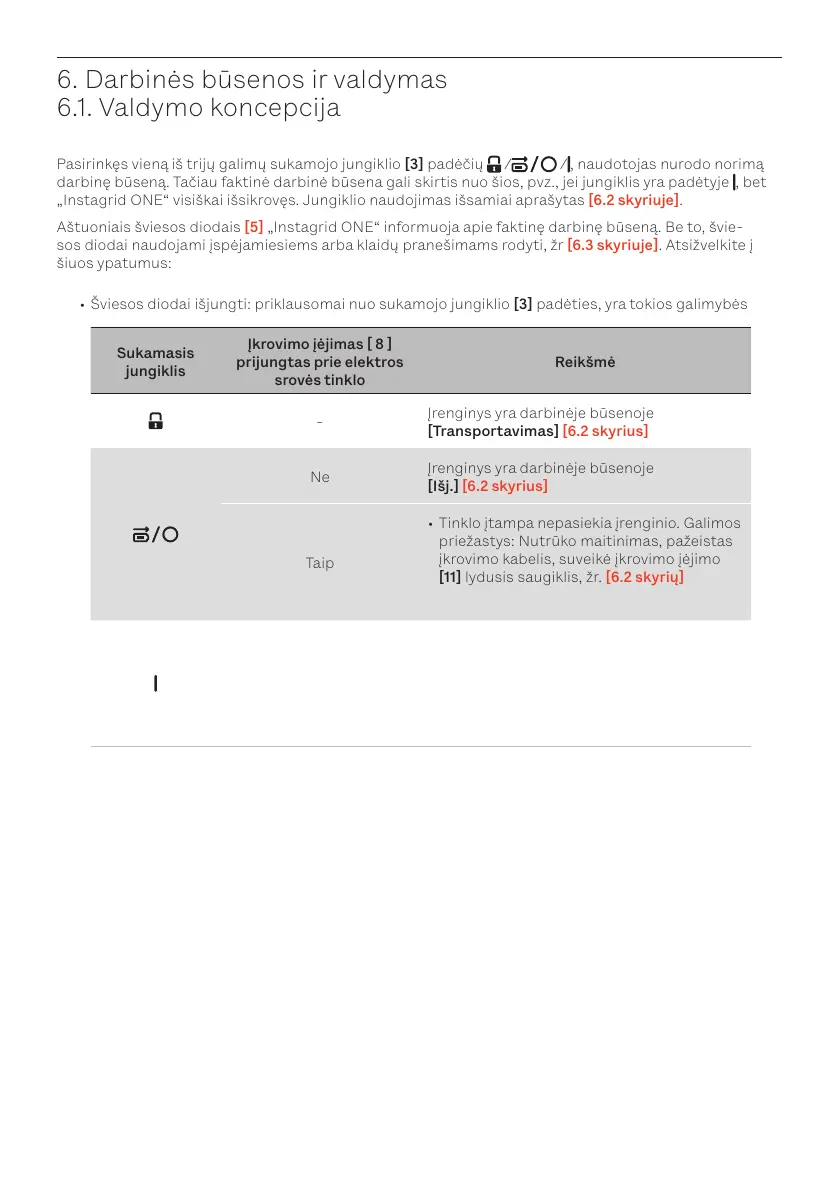„Instagrid ONE“ visiškai išsikrovęs. Jungiklio naudojimas išsamiai aprašytas [6.2 skyriuje].