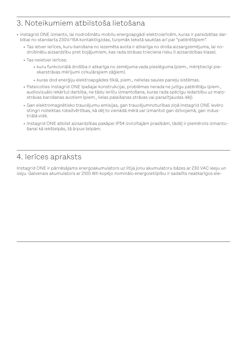 • Gan elektromagnētisko traucējumu emisijas, gan traucējumnoturības ziņā Instagrid ONE ievēro