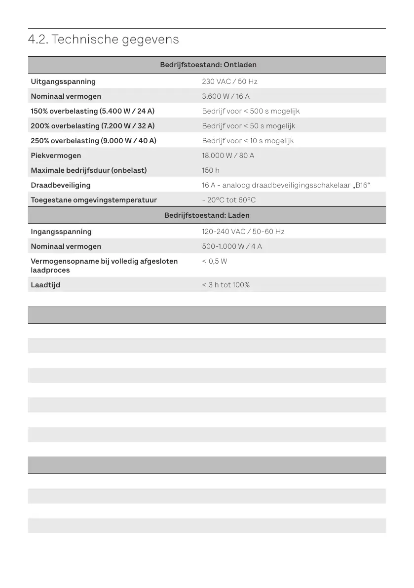 250% overbelasting (9.000 W / 40 A) Bedrijf voor < 10 s mogelijk