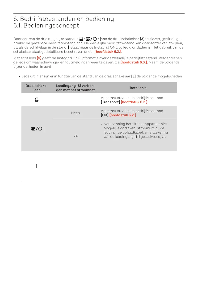 bv. als de schakelaar in de stand staat maar de Instagrid ONE volledig ontladen is. Het gebruik van de