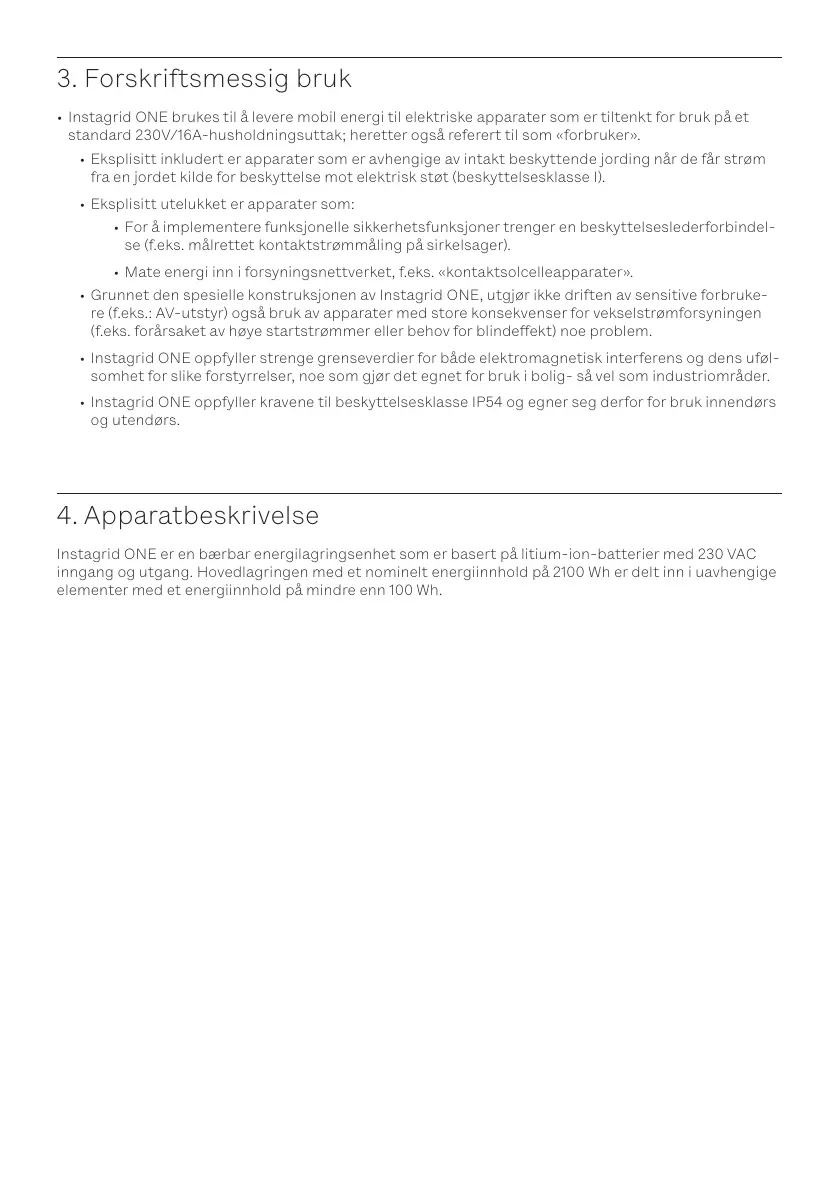 • Instagrid ONE oppfyller kravene til beskyttelsesklasse IP54 og egner seg derfor for bruk innendørs