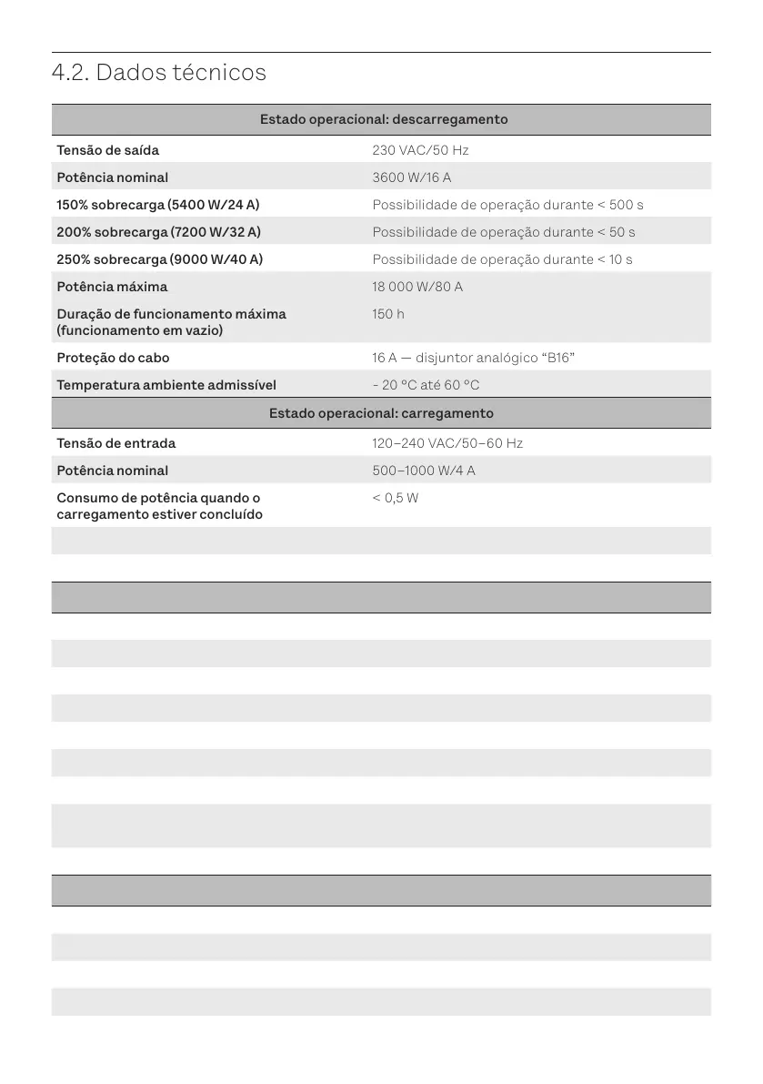250% sobrecarga (9000 W/40 A) Possibilidade de operação durante < 10 s