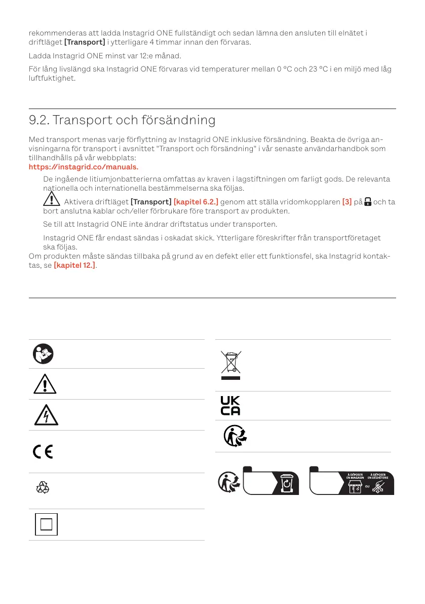 Med transport menas varje föryttning av Instagrid ONE inklusive försändning. Beakta de övriga an-