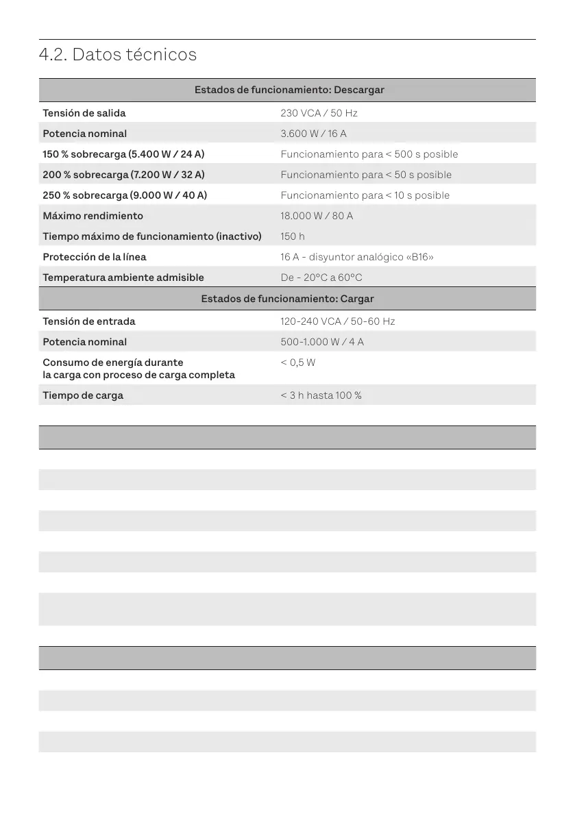250 % sobrecarga (9.000 W / 40 A) Funcionamiento para < 10 s posible