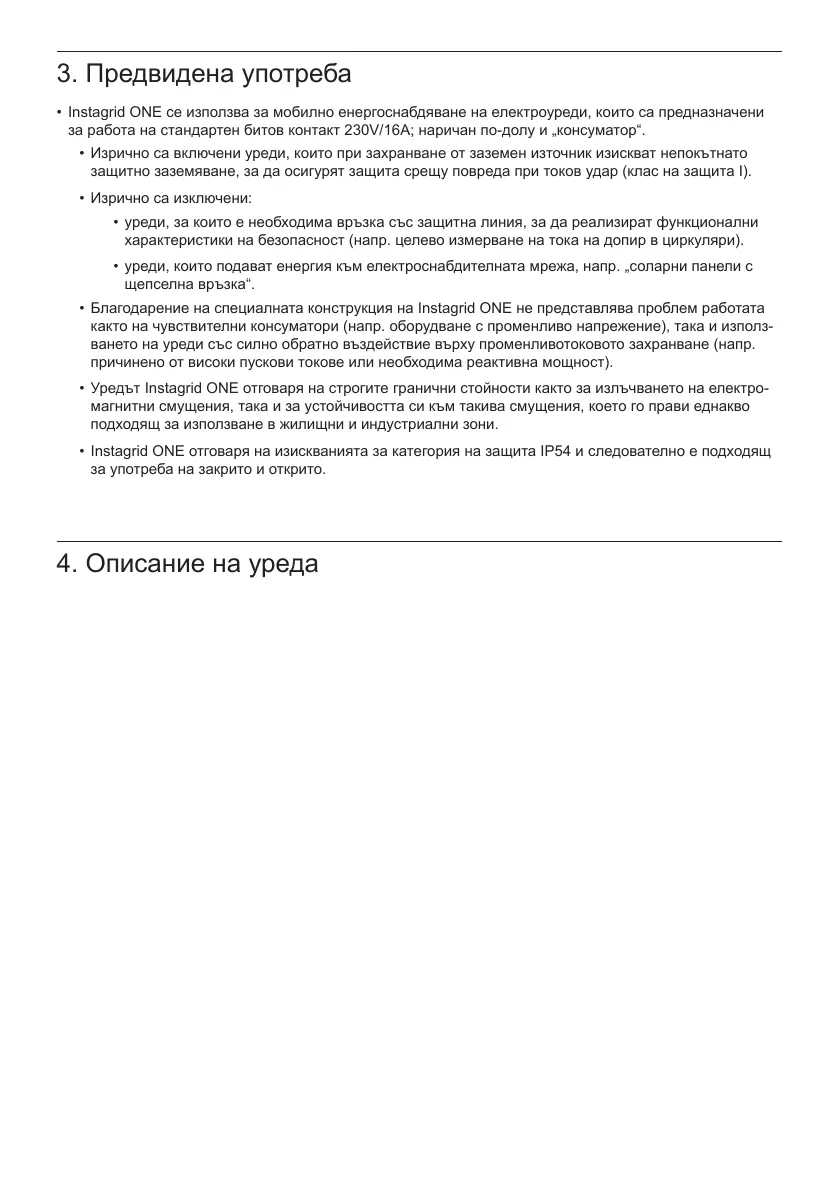 • Instagrid ONE отговаря на изискванията за категория на защита IP54 и следователно е подходящ