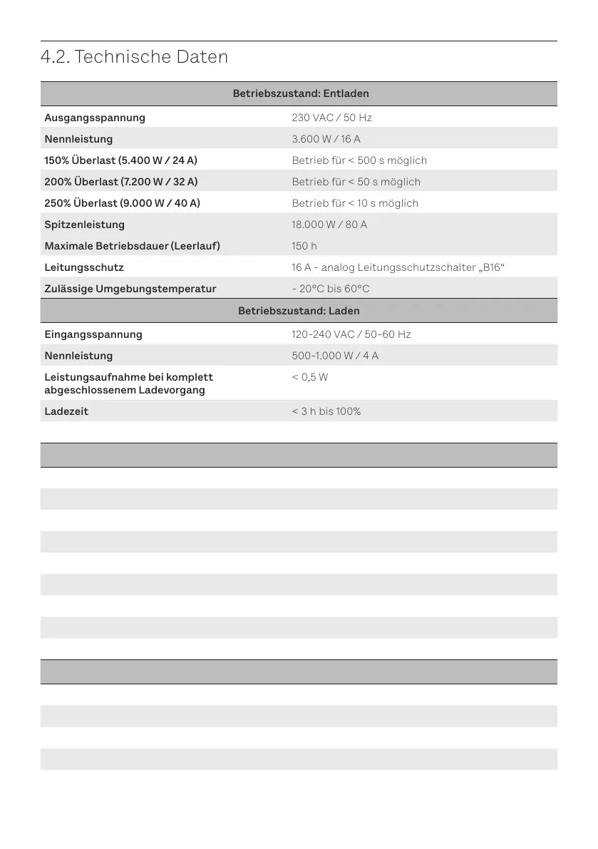 150% Überlast (5.400 W / 24 A) Betrieb für < 500 s möglich