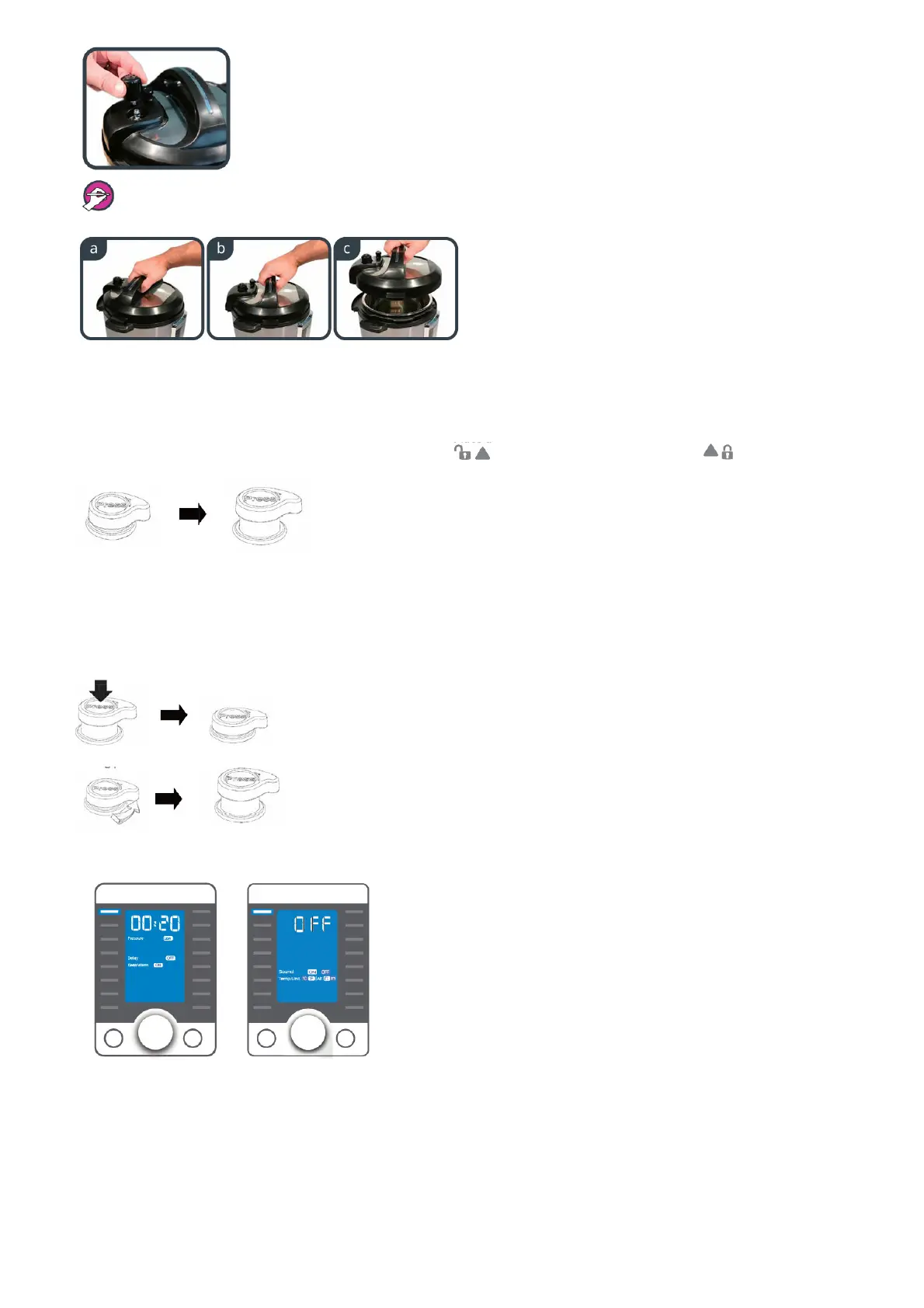 7. Place the lid on the pressure cooker, align the ▼ mark on the lid with the ‘ (unlock) mark and turn clockwise to the (lock) mark.