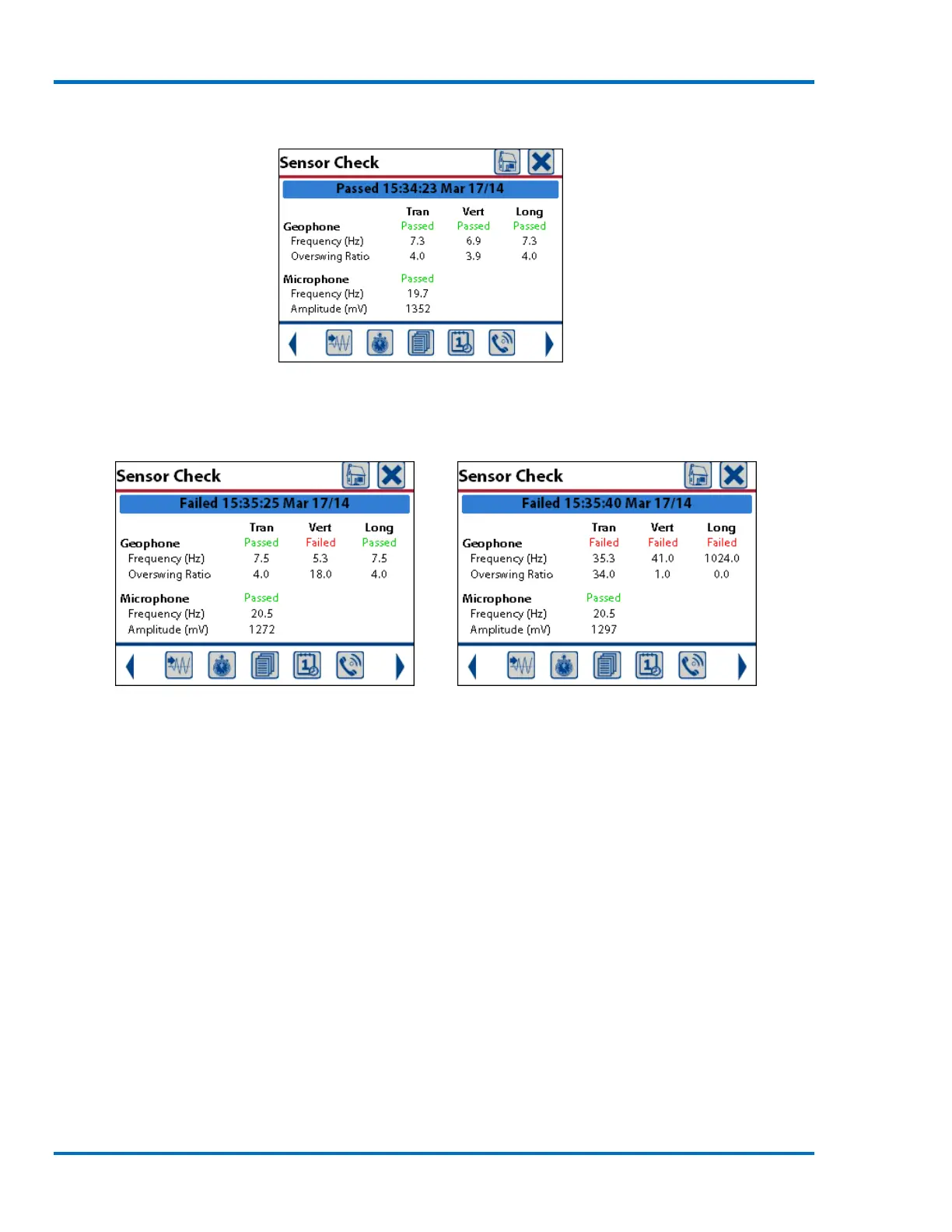 If the geophone sensor check fails, a failure message will appear in one or more of the Transverse,