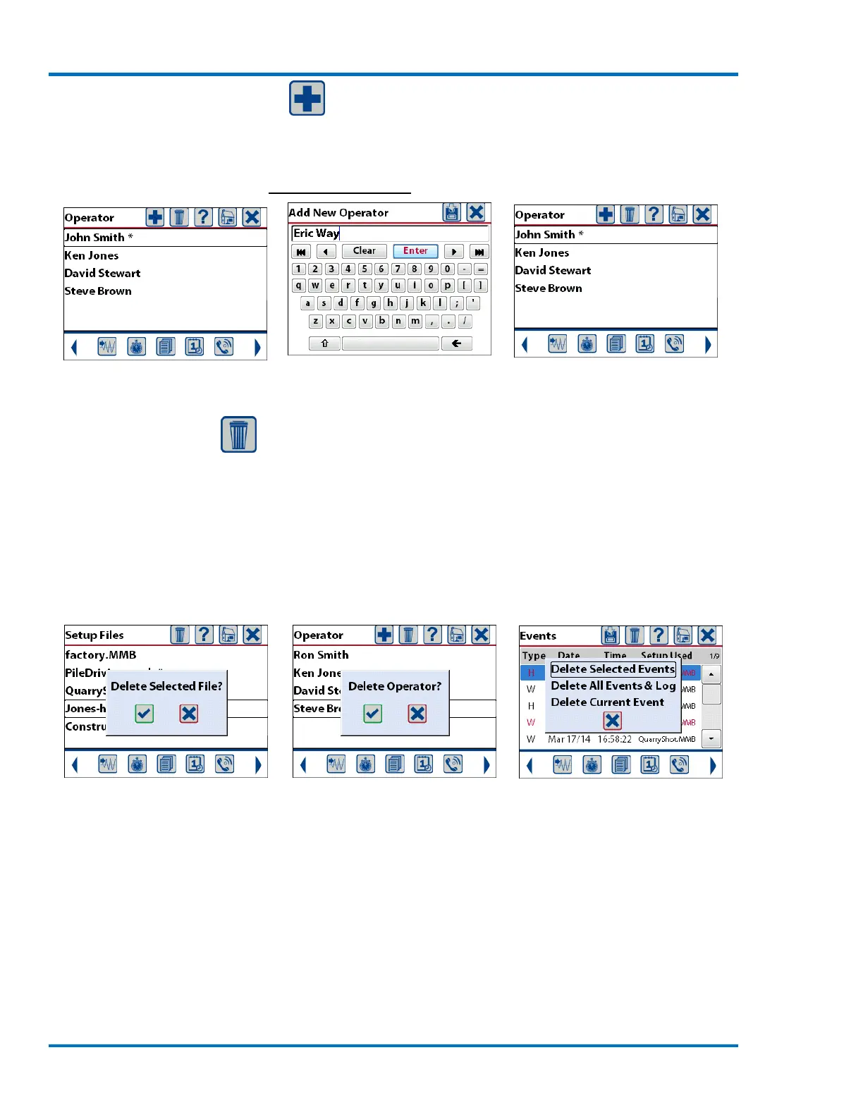 The Delete icon will only be displayed in the Select Setup File, Select Operator and Event List