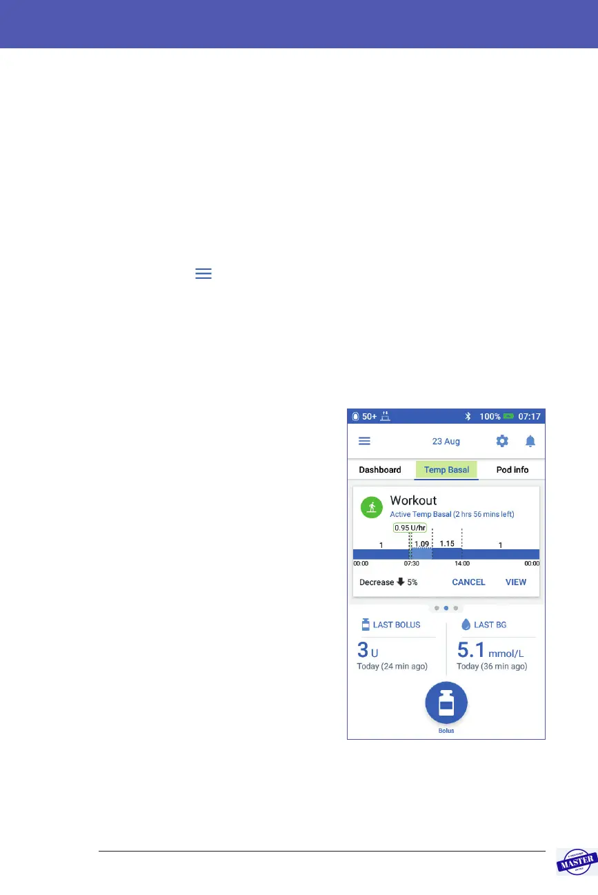 Aer activation, the Home screen’s Basal tab, renamed Temp Basal, indicates that