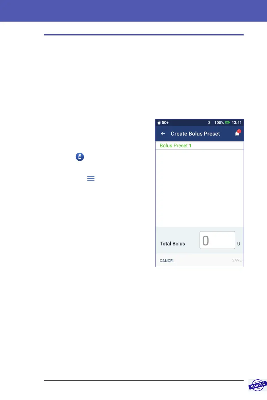 7. Tap the Total Bolus eld and enter the units of insulin for the bolus preset.